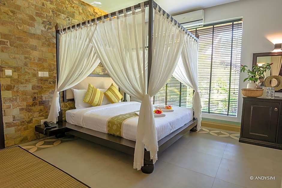 This Khmer-style room features a private terrace that opens up to views. The separate living area is fitted with a sofa, an antique desk, a 32-inch flat-screen TV and a DVD player. The bathroom offers an outdoor bathtub and a rain shower and a traditional Khmer shower facility surrounded by a garden. This room can accommodate up to 1 extra beds. Additional charges apply.