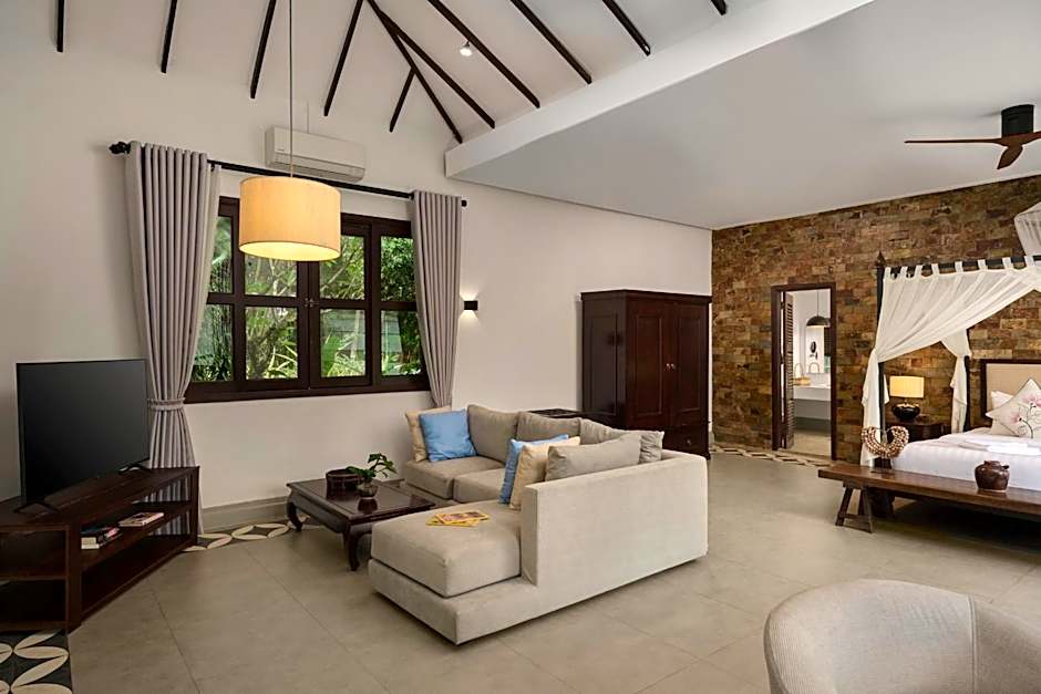 The 150sqm Khmer-style Family Suite combines two rooms: one king-size bed and two single beds. It features a large living and dining area, two flat-screen TVs, mini-bar, and antique desk. Both bathrooms include outdoor bathtubs, rain showers, and Khmer-style showers, all surrounded by private tropical gardens.