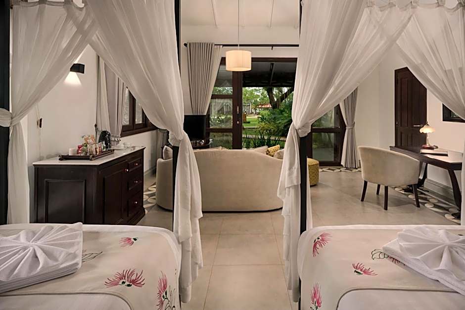 Our 75sqm Twin room offers two single 4-poster beds and a large living area with sofa, flat-screen TV, mini-bar, and antique desk. The bathroom includes an outdoor bathtub, rain shower, and Khmer-style shower, all surrounded by your private tropical garden.