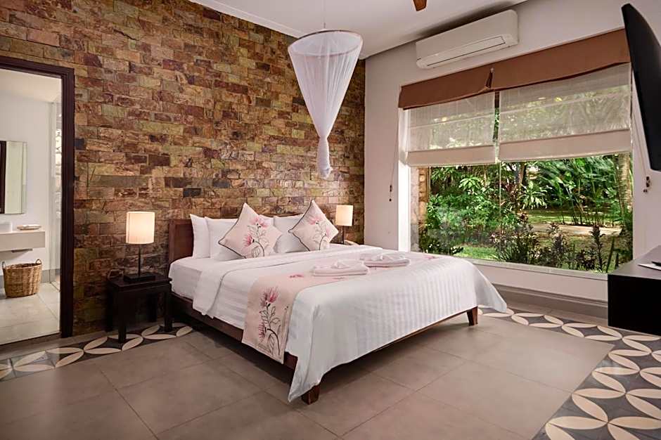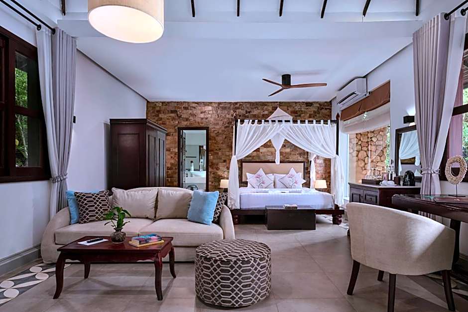 This traditional Khmer style Double room of 75sqm with local design features a king size 4poster bed, it offers a large living area with sofa, 1 big size Flat-screen television, a mini-bar and an antique desk. Each room has a big bathroom with an outdoor bathtub, a rain shower and a traditional Khmer shower surrounded by a private lush garden.
